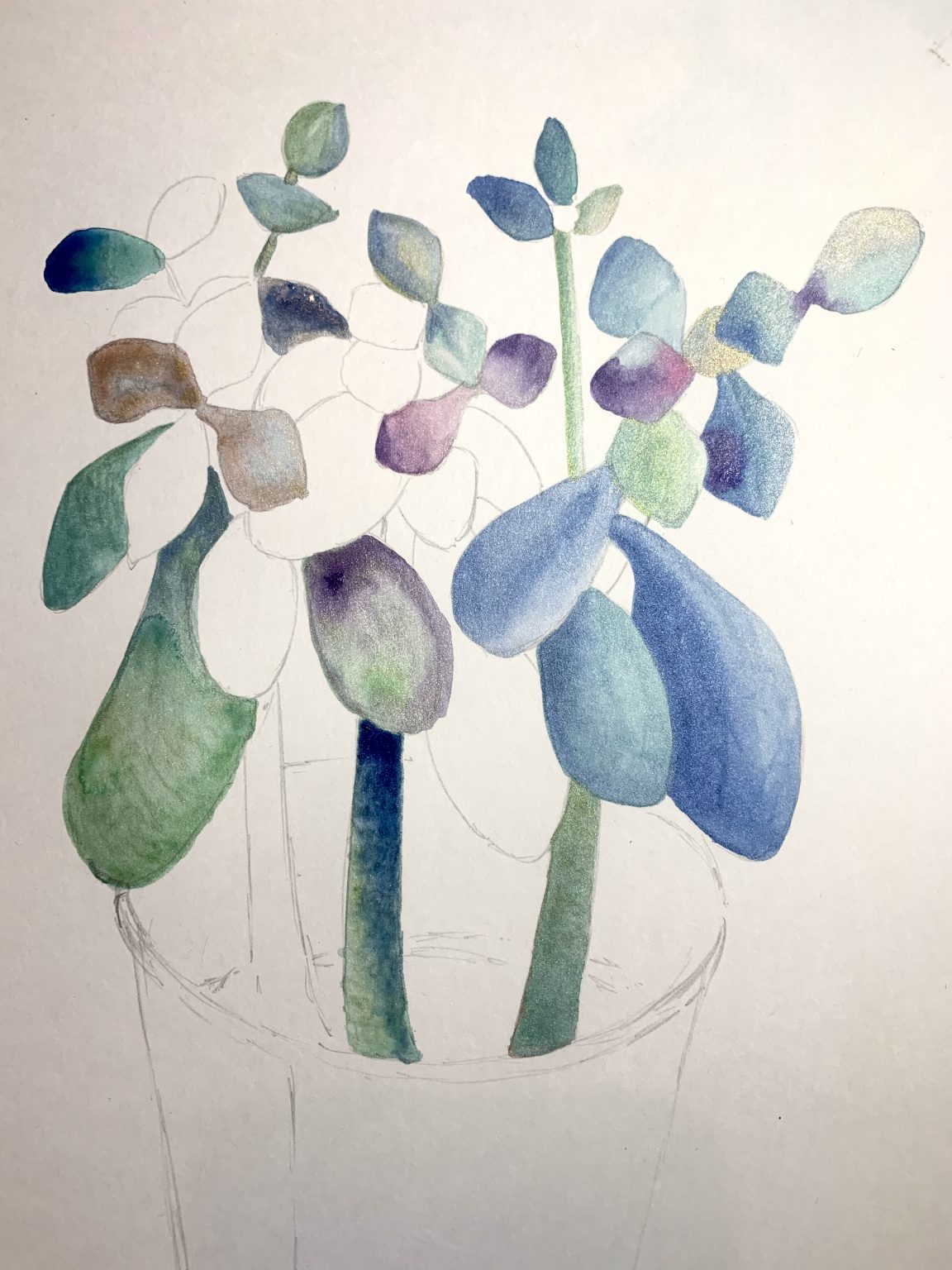 I covered the area of the tin plant pot with water, then a wash of silver and then darkened with darker silvers to create curves and shadows on the outer edges and lower rim. The upper edge was added very last to ensure the edges remained crisp and did not go ‘woolly’ or blurred. Textures could be added on the plant stems and the soil for final details.